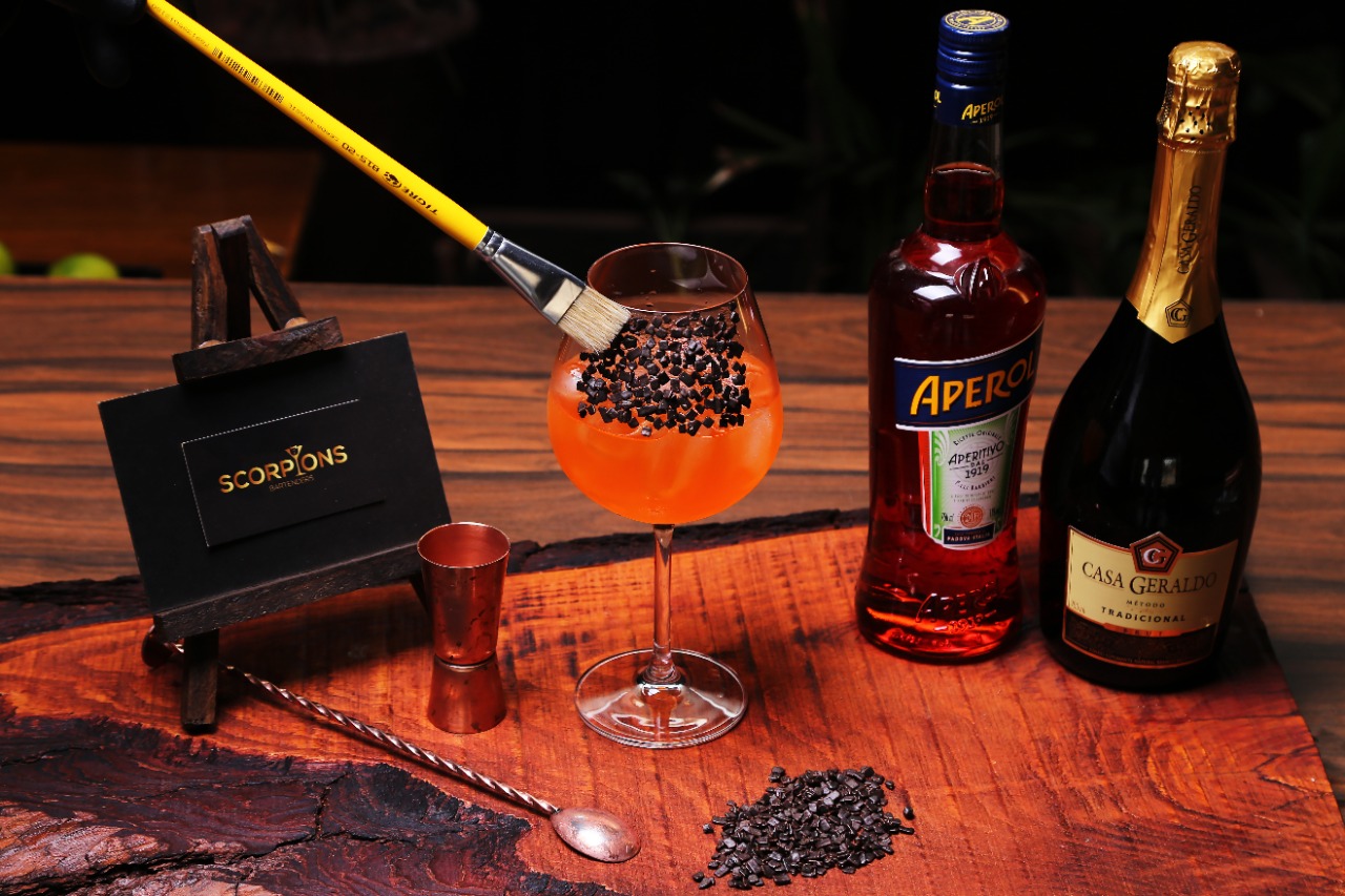 Espumante, aperol, infusão de maracujá e borda de chocolate