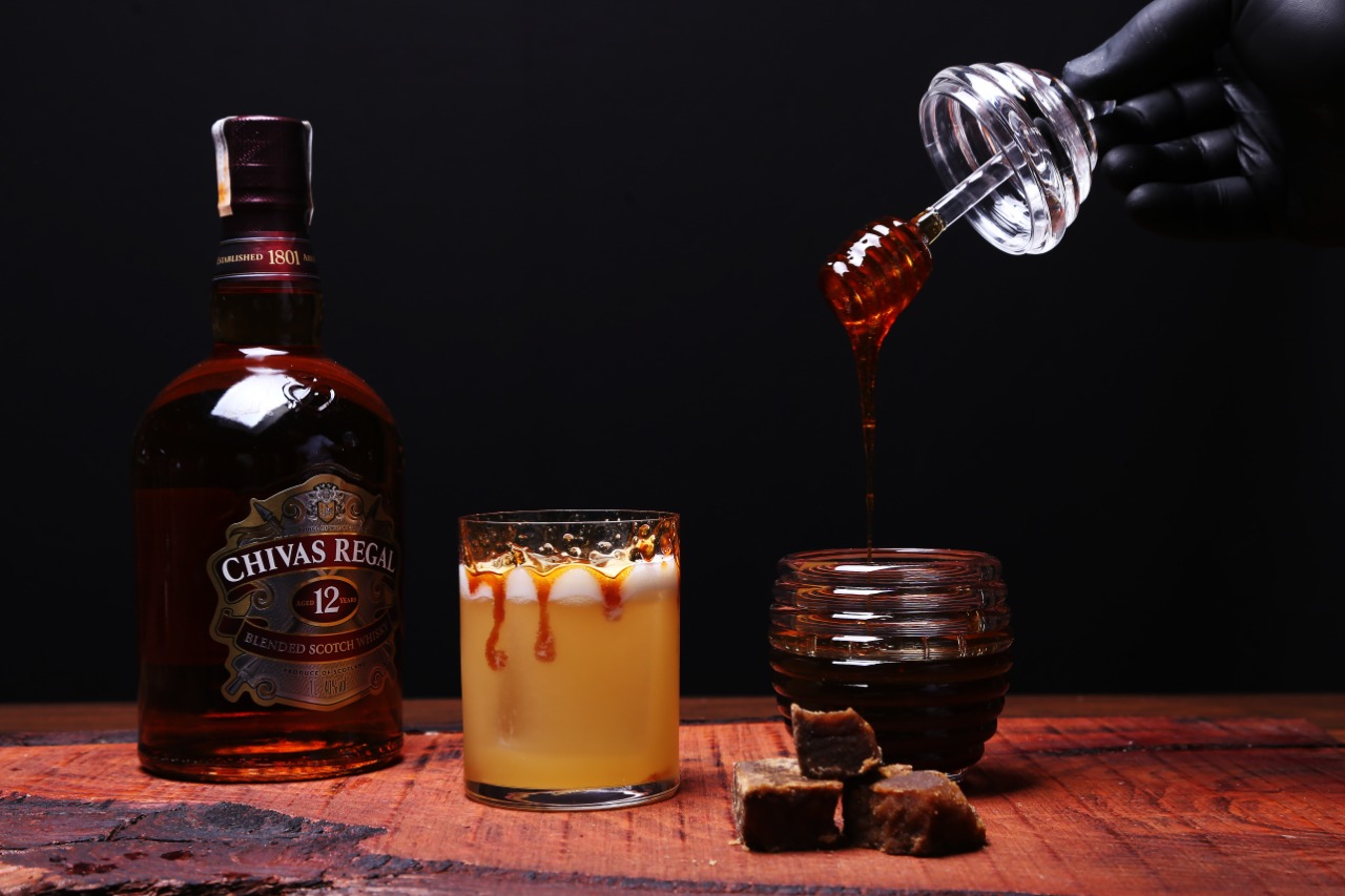 Whisky, infusão de rapadura, mix sour, espuma de limão e borda de melaço